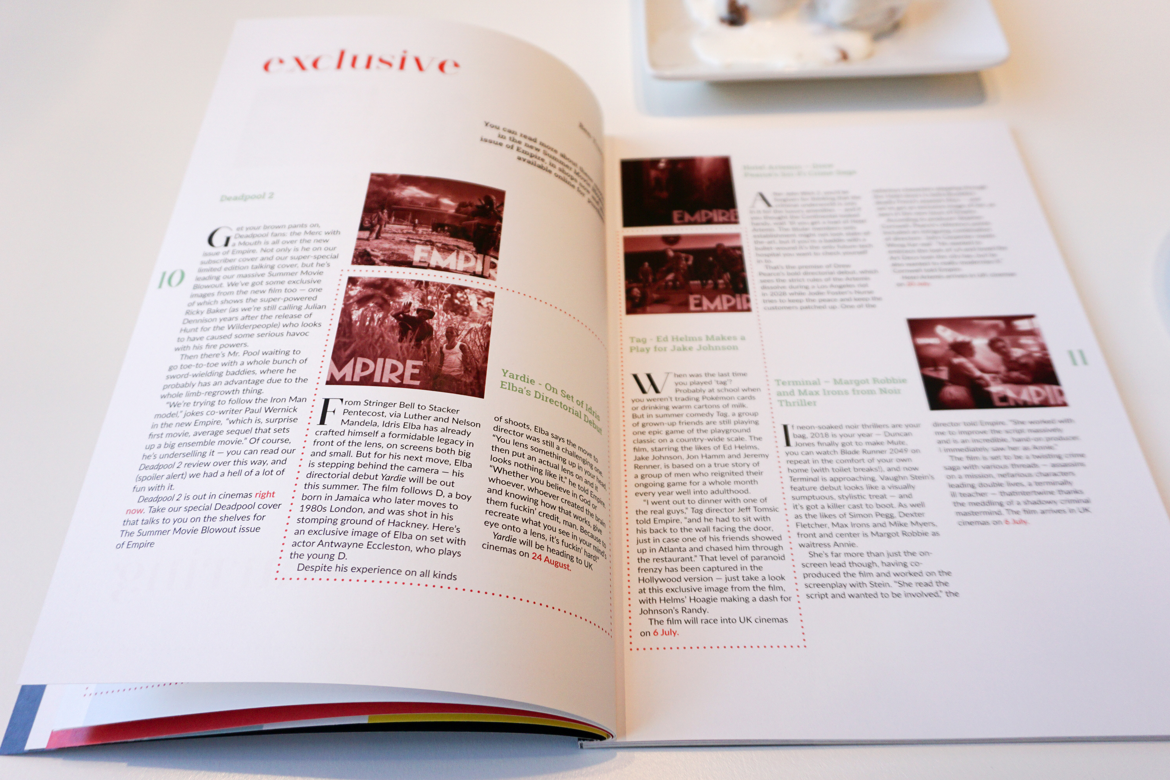 The original magazine consists of three regular sections: Preview, On screen and Review, while I changed them into: Buzz, In cinemas and At home and kept How much is a pint of milk? and Classic scene as identical articles of Empire issues.